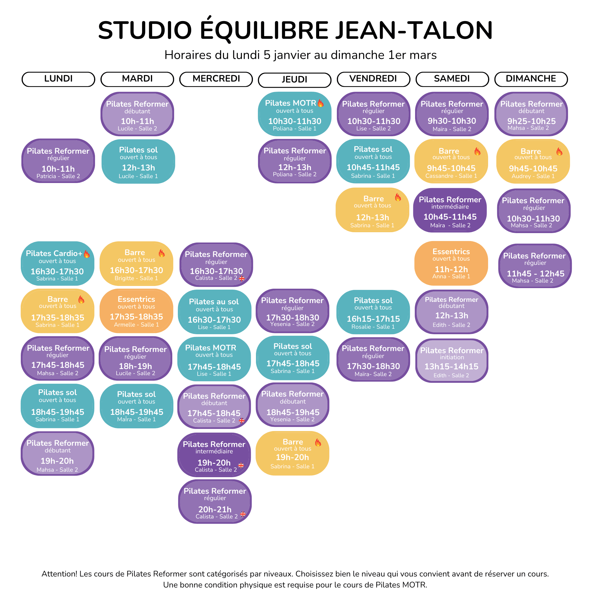 Grâce aux onglets, vous pouvez trier les cours affichés ci-dessous en fonction de vos préférences : localisation du studio, niveau, professeur, etc.